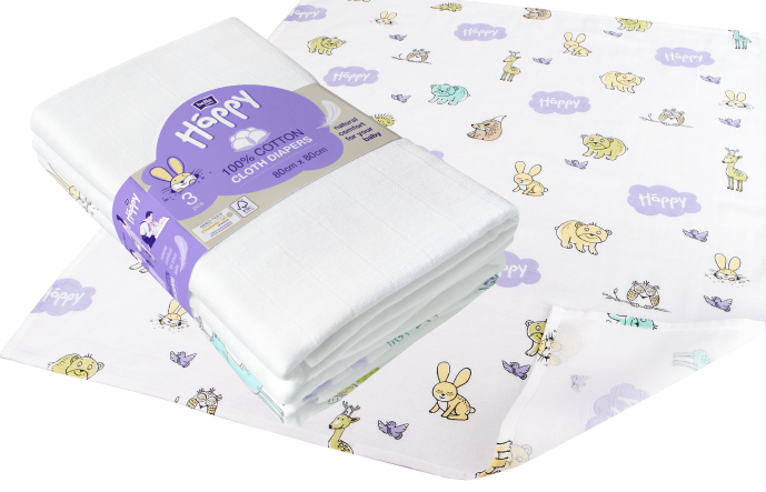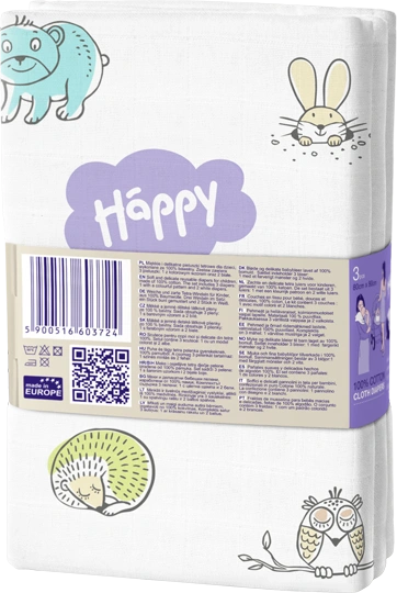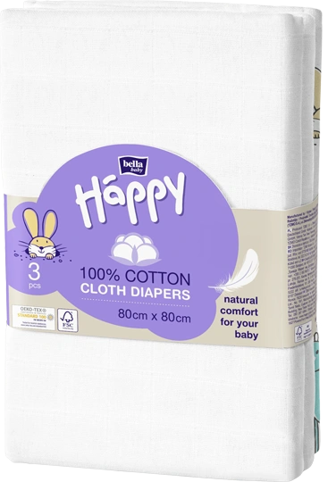 Zachte, katoenen Bella Baby Happy tetra luiers (hydrofiele doeken) zijn onmisbaar voor elke ouder. Ze vormen de basis van de babyuitzet en kunnen worden gebruikt als washandje tijdens het baden, handdoek om de babyhuid af te drogen, licht dekentje, spuugdoek voor op de schouder van de ouder of als knuffeldoek. De set bevat 3 tetra luiers van 80x80 cm: 2 witte en 1 met een kleurrijke print. De productveiligheid is bevestigd door het OEKO-TEX® certificaat.